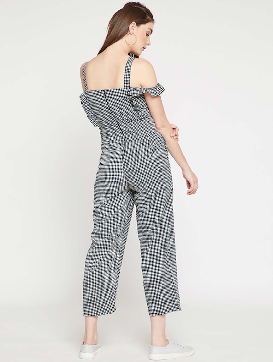 Black and white checked culotte jumpsuit with Ruffles, has a square neck, short sleeves, two pockets