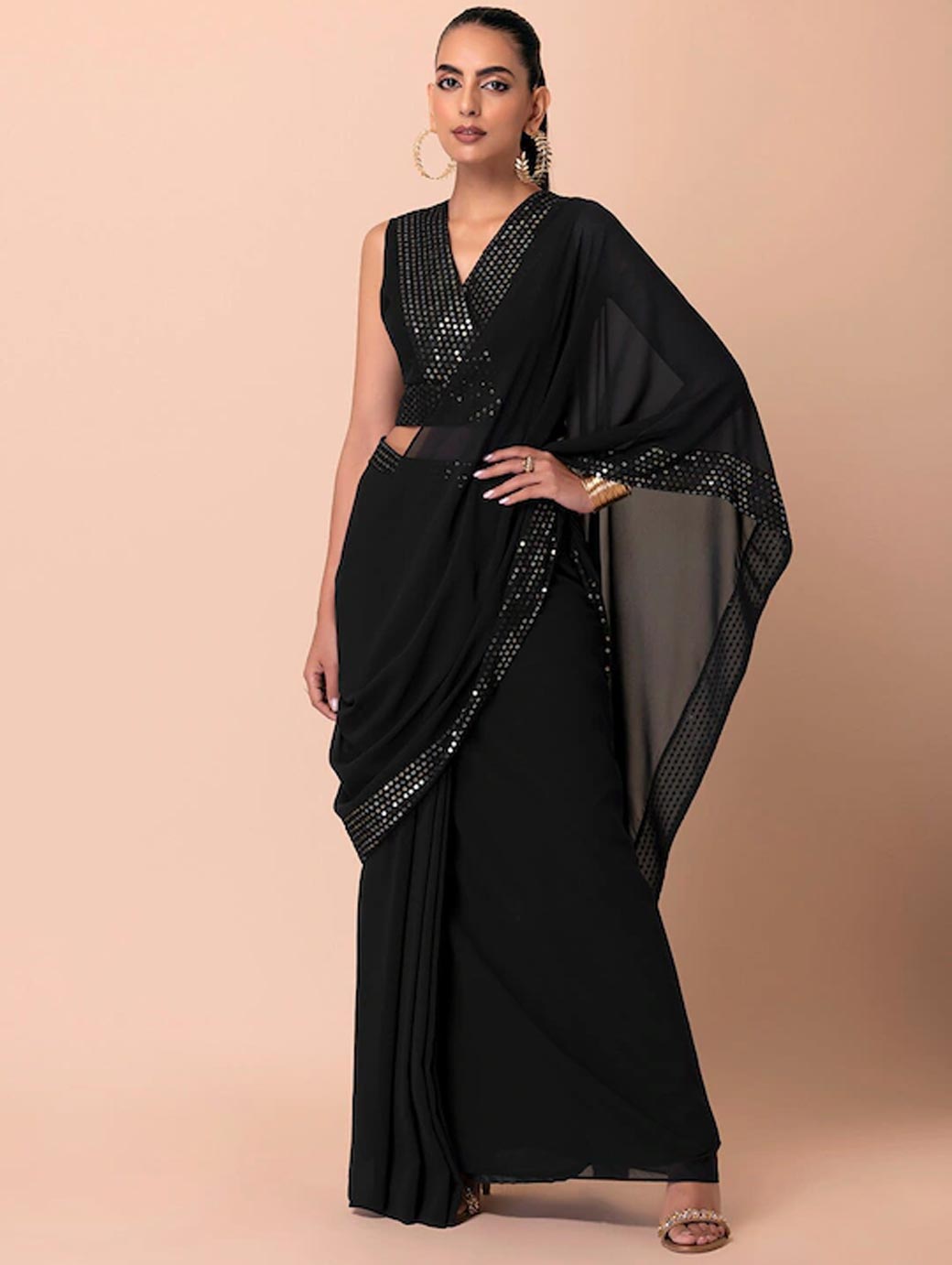 Black crop wrap ethnic top Embellished V-neck, sleeveless, no sleeves Sequined detail Woven.