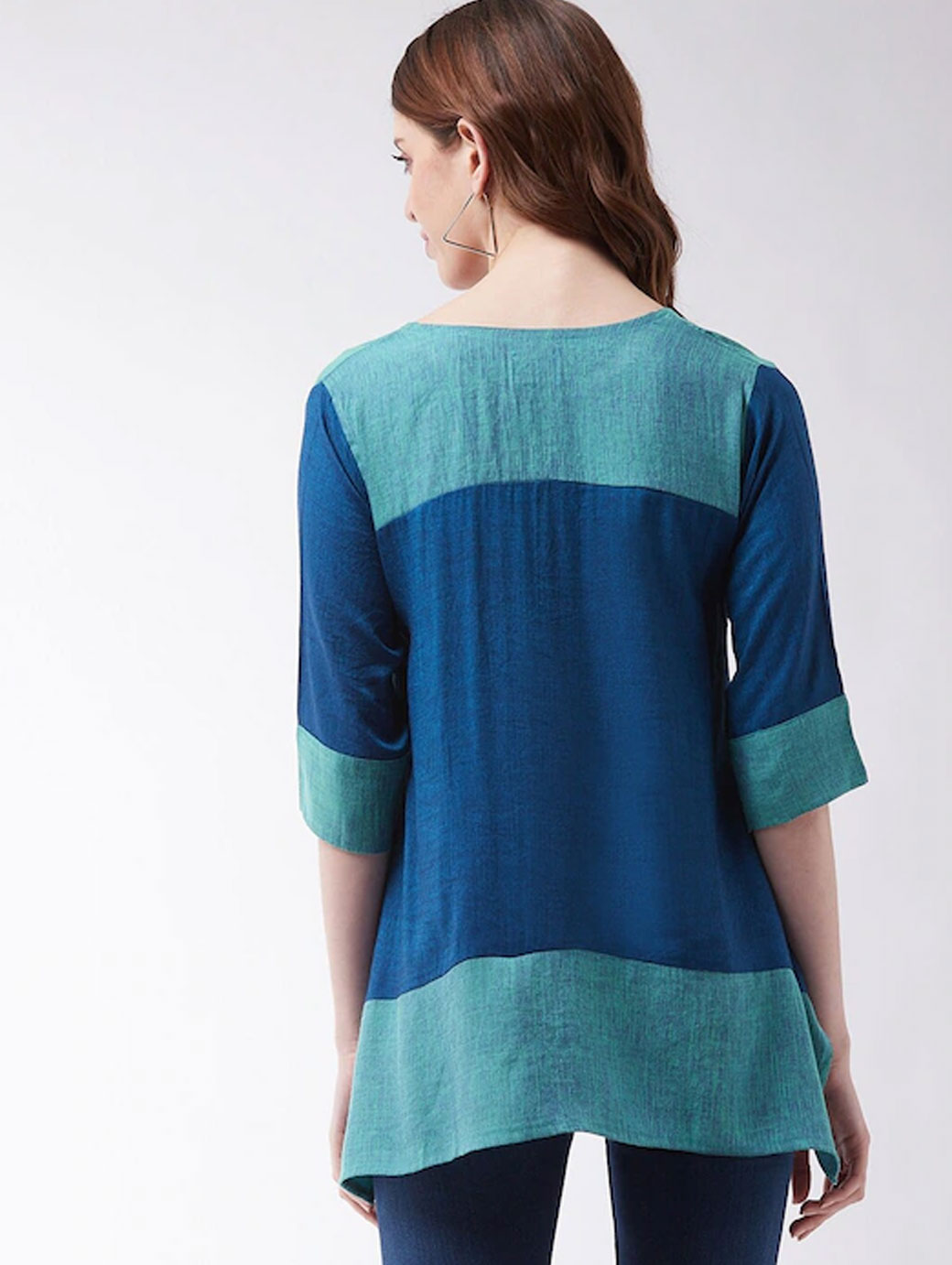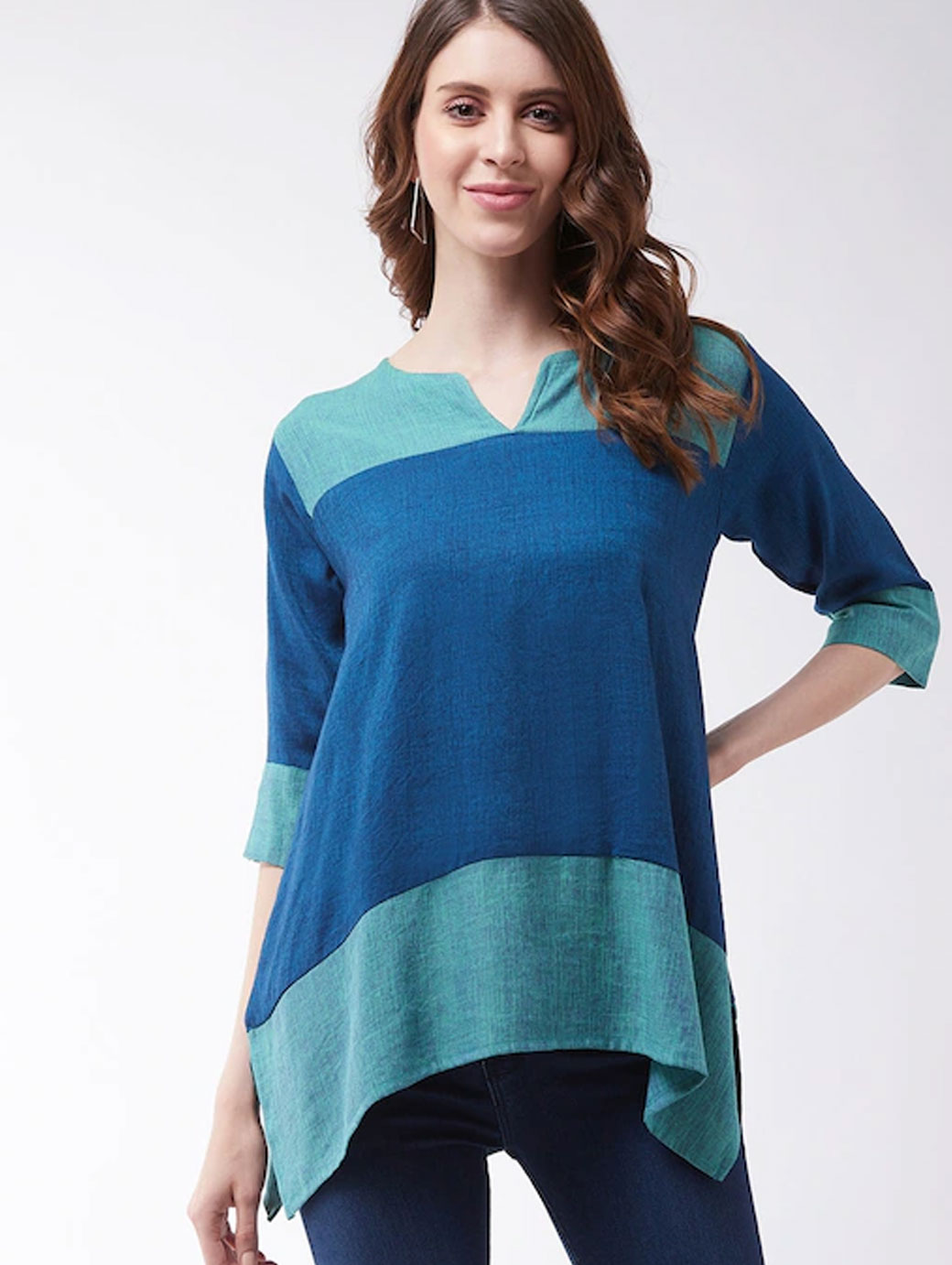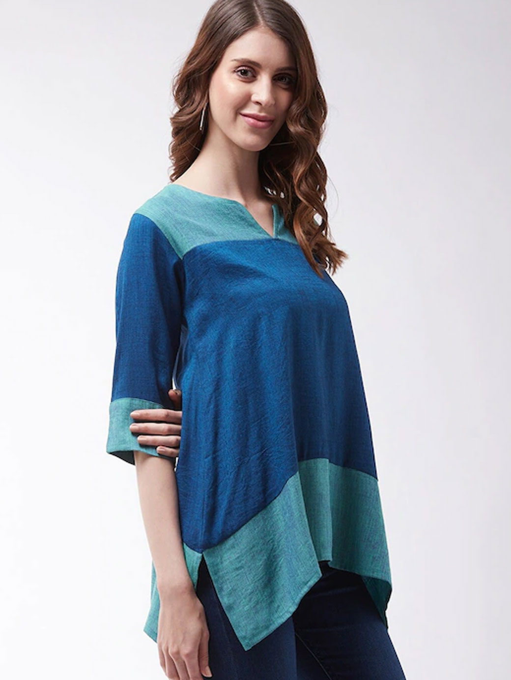 Blue regular a-line top Colour blocked V-neck, three-quarter, regular sleeves Handloom cotton