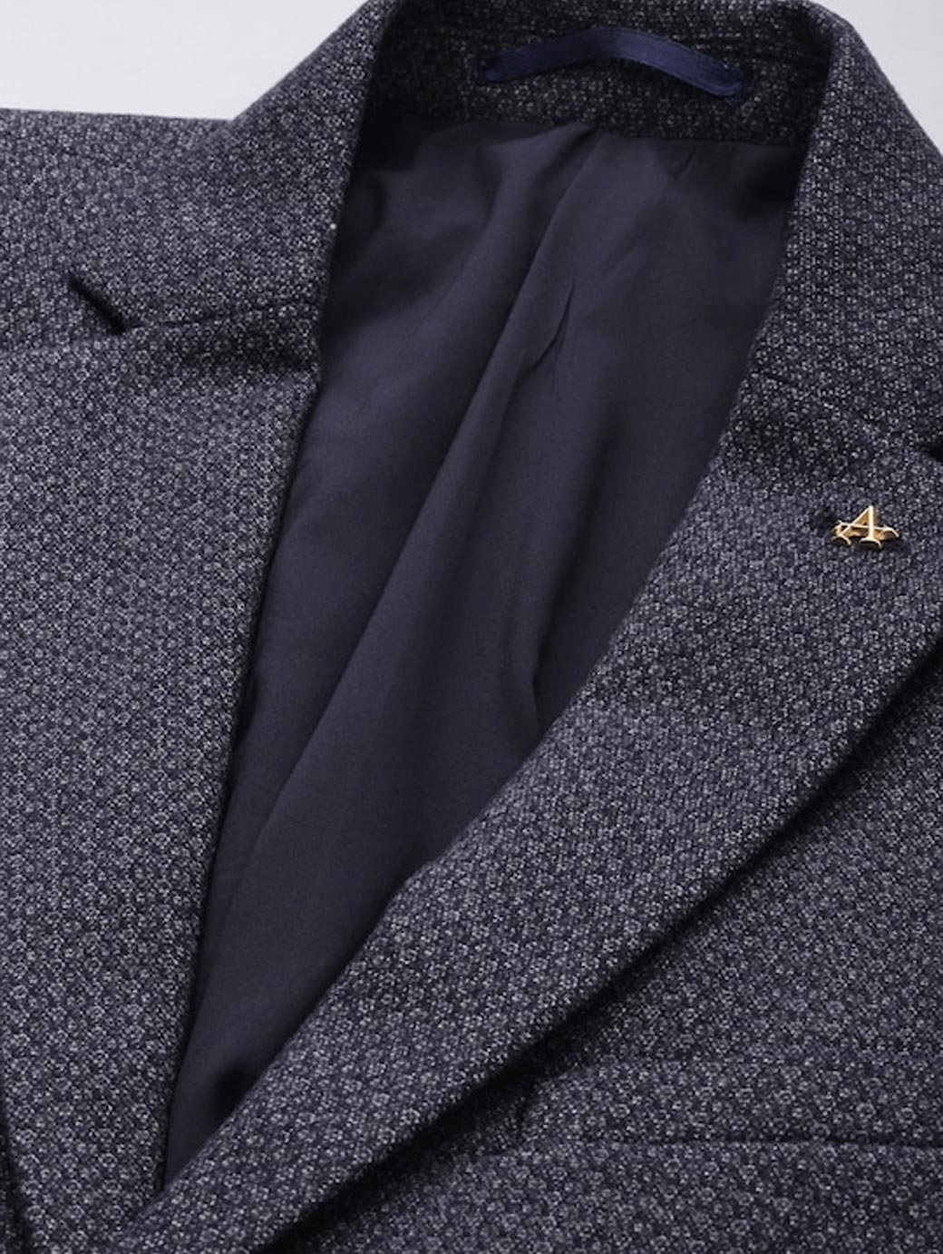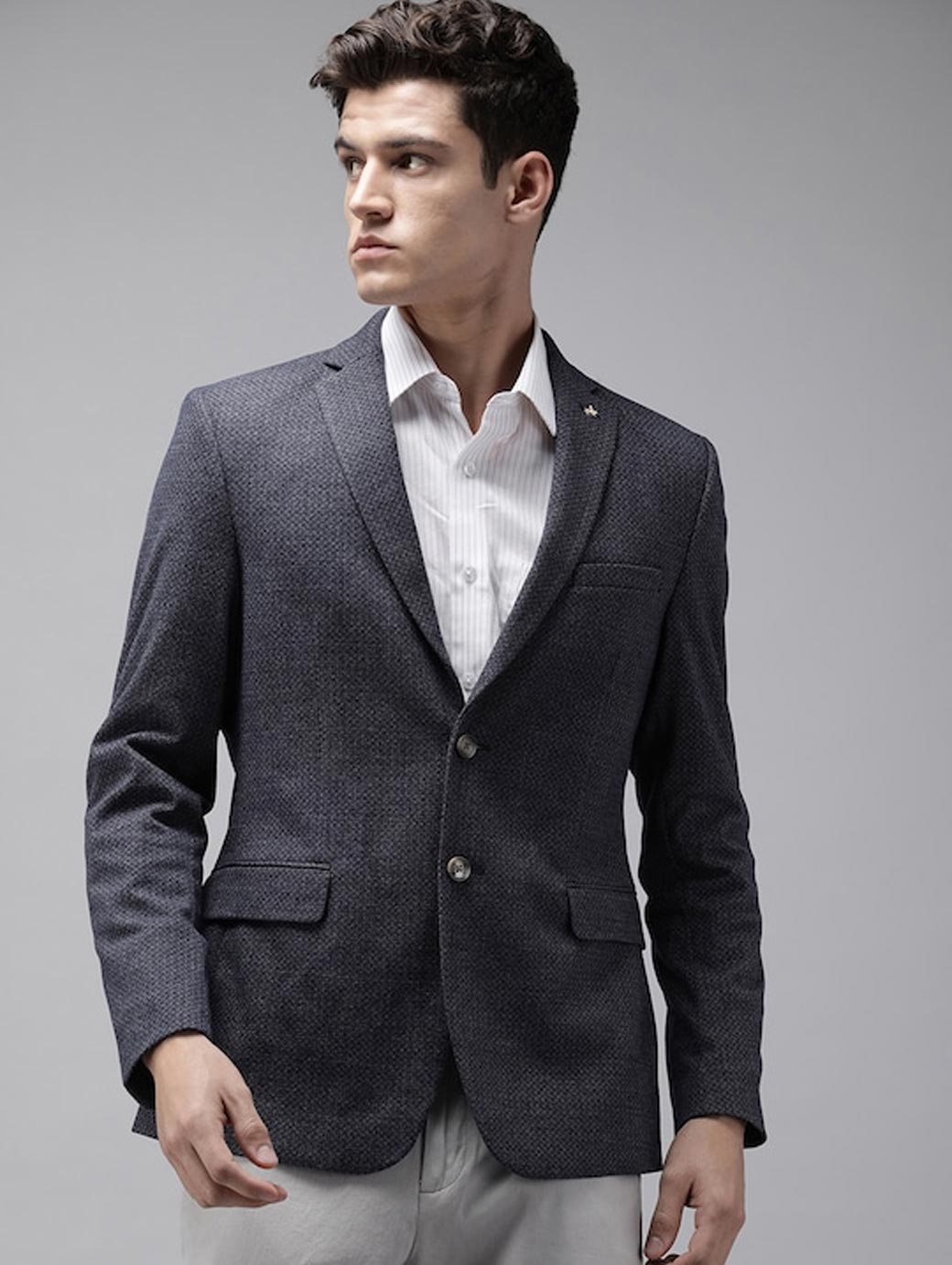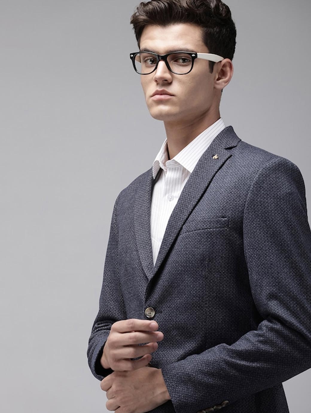 Navy blue self-design slim-fit smart casual blazer, has a notched lapel, long sleeves, single-breasted with double button closure, two flap pockets, one welt pocket and a double-vented back hem