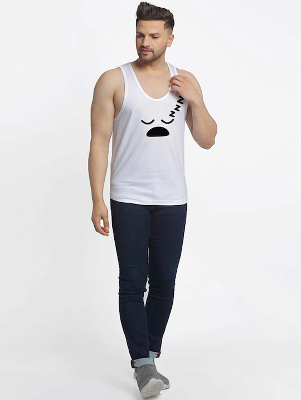 Innerwear gym vests White and black sleepy printed innerwear vest, has a round neck, sleeveless White and grey , has a round neck, sleeveless .