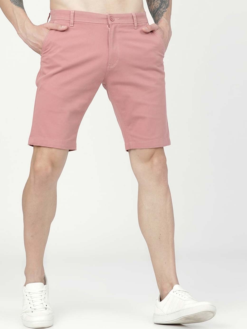 Pink solid mid-rise regular shorts, has 4 pockets, and button closure