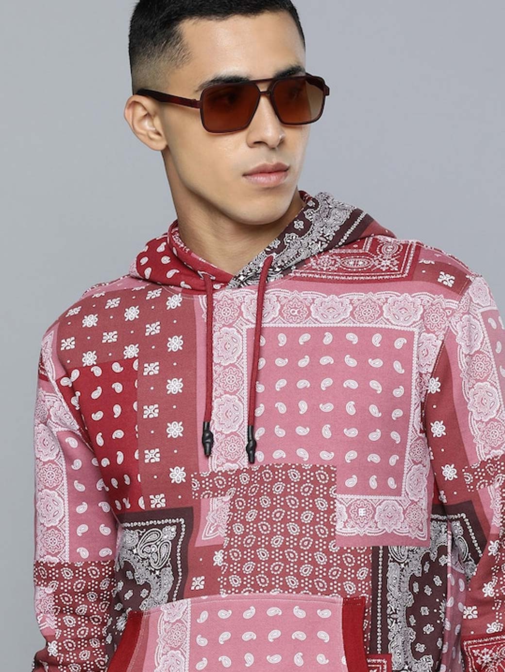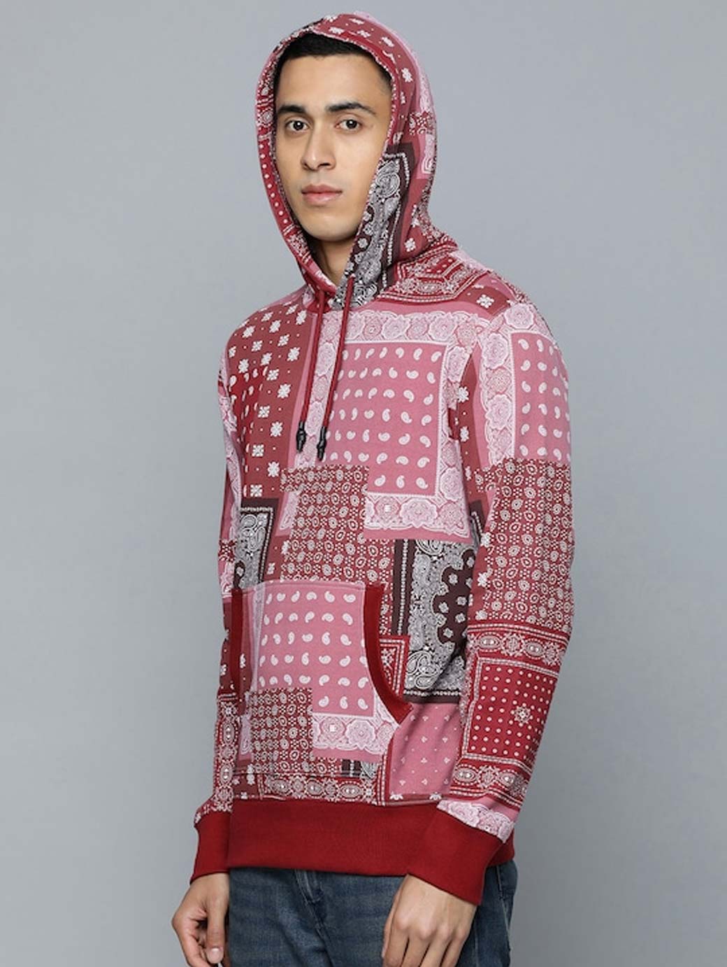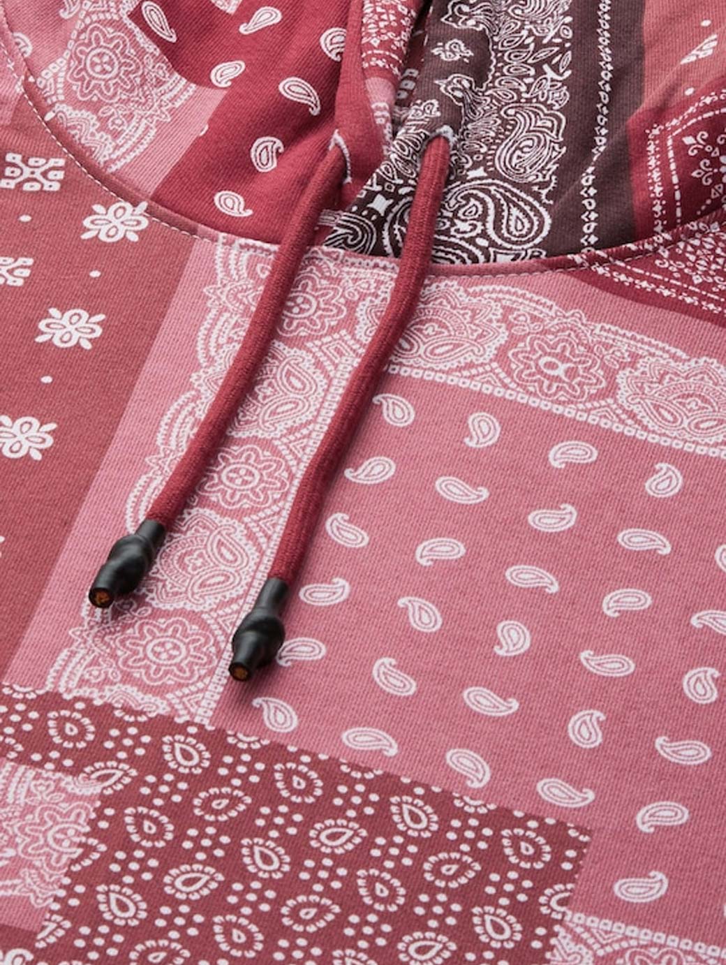 Red & pink bohemian printed sweatshirt has a hood, 1 kangaroo pocket, long sleeves, ribbed hem