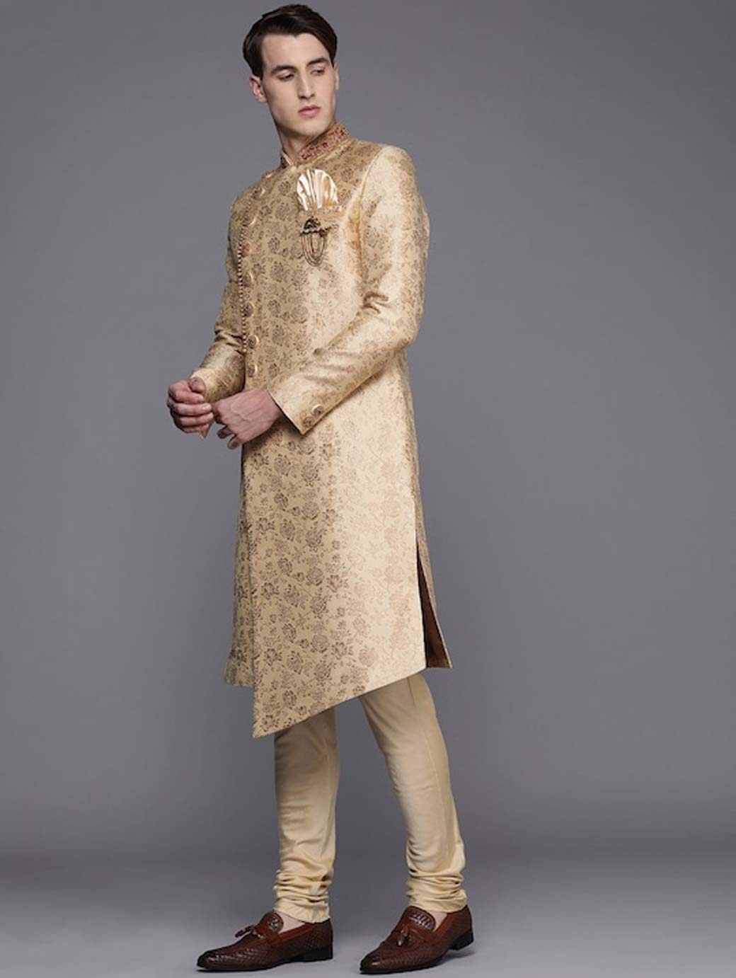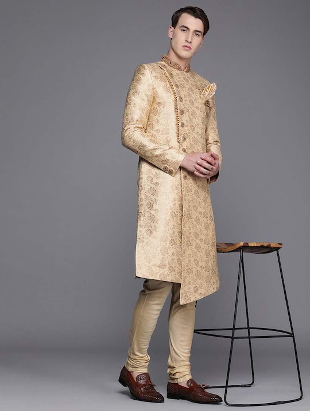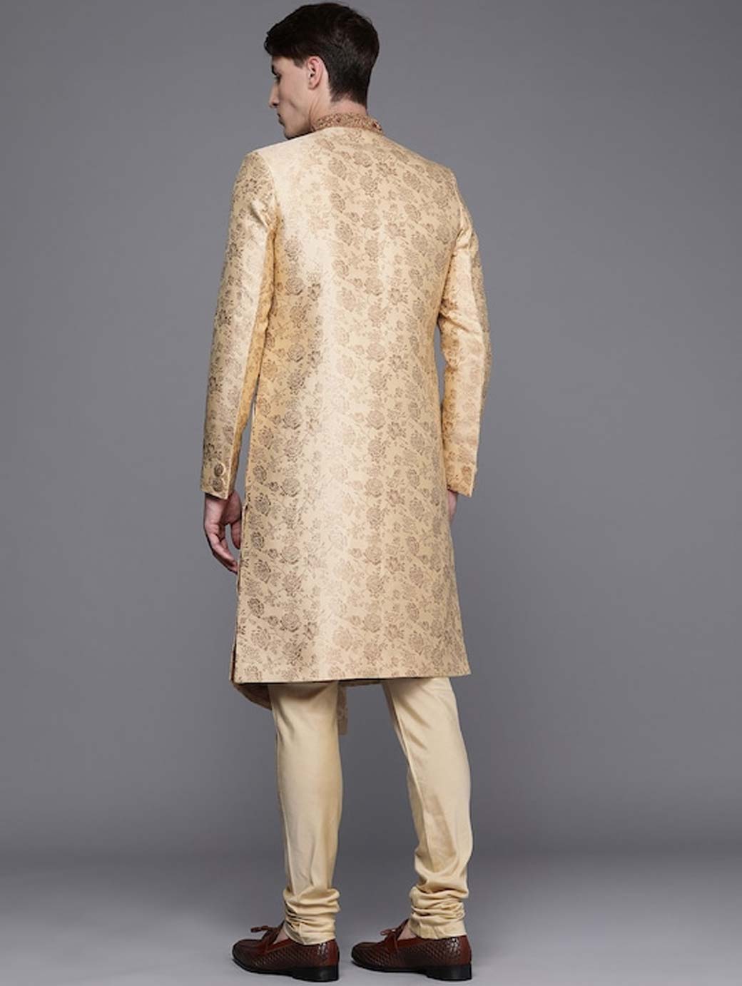 Kurta design: Ethnic motifs printed Straight shape Regular style Mandarin collar, long regular sleeves 2 pockets Above knee length with straight hem Raw silk knitted and woven fabric Nehru jacket