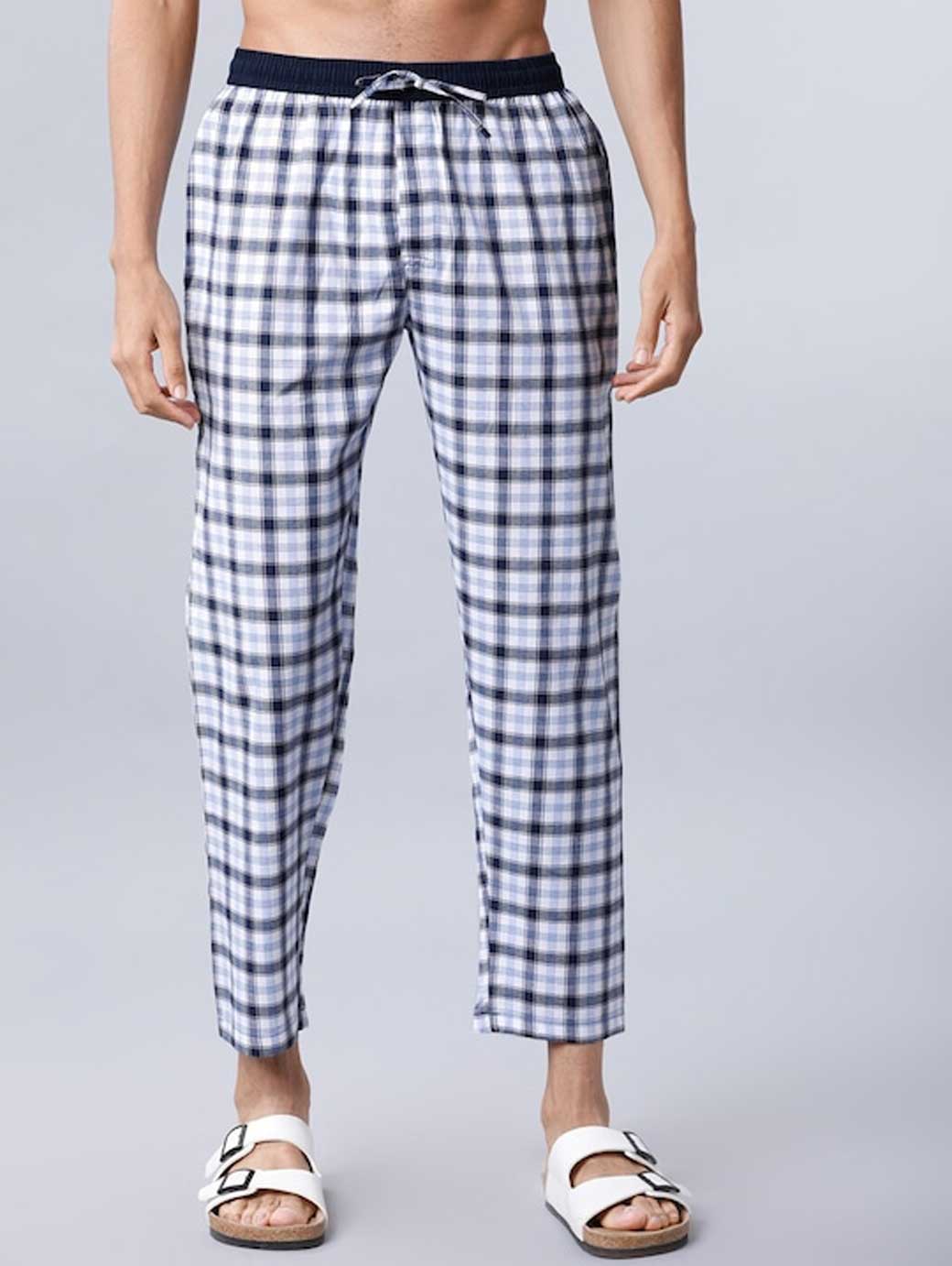 White checked mid-rise cropped lounge pants, has an elasticated waistband with a drawstring fastening, two pockets
