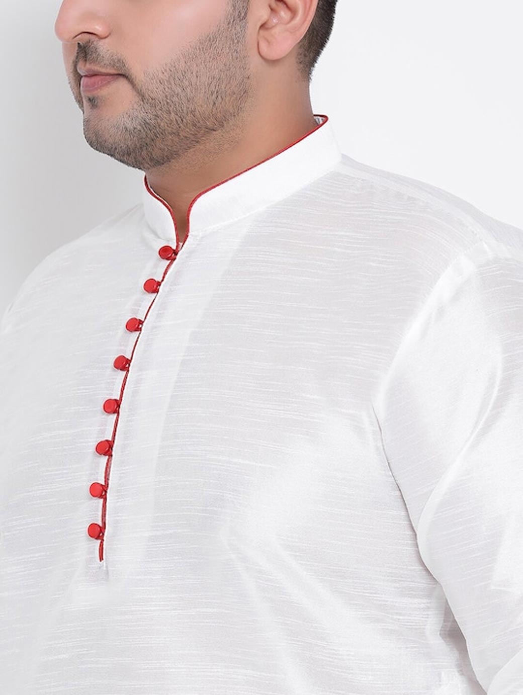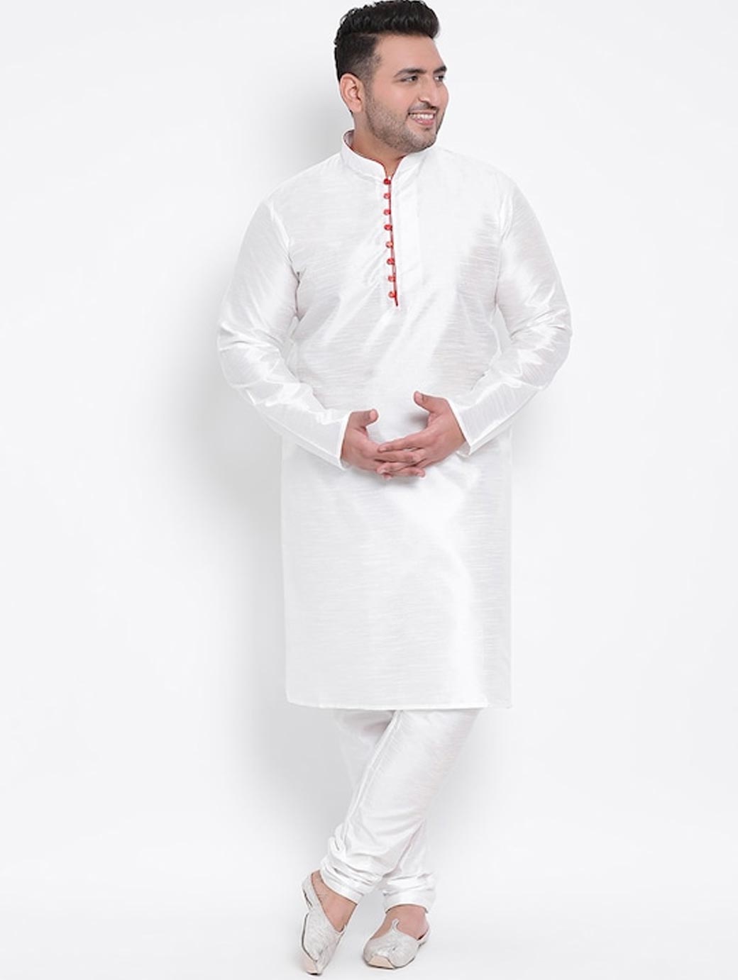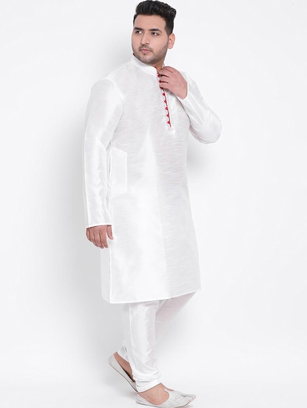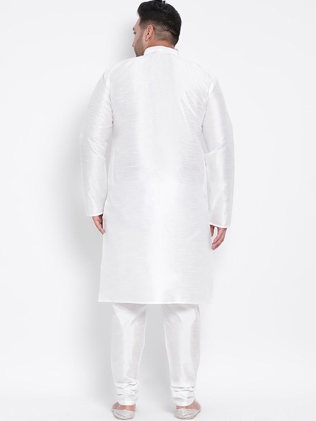 White solid kurta with pyjamas White straight knee length kurta, has a mandarin collar, long sleeves, curved hem White solid pyjamas, drawstring closure