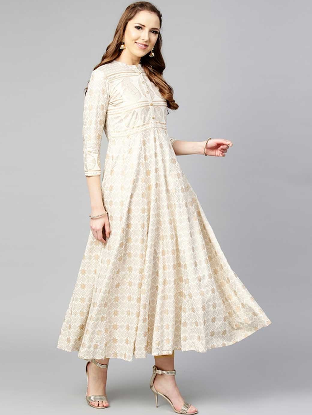 Off-White & Golden Ethnic Foil Print Panelled Anarkali Kurta