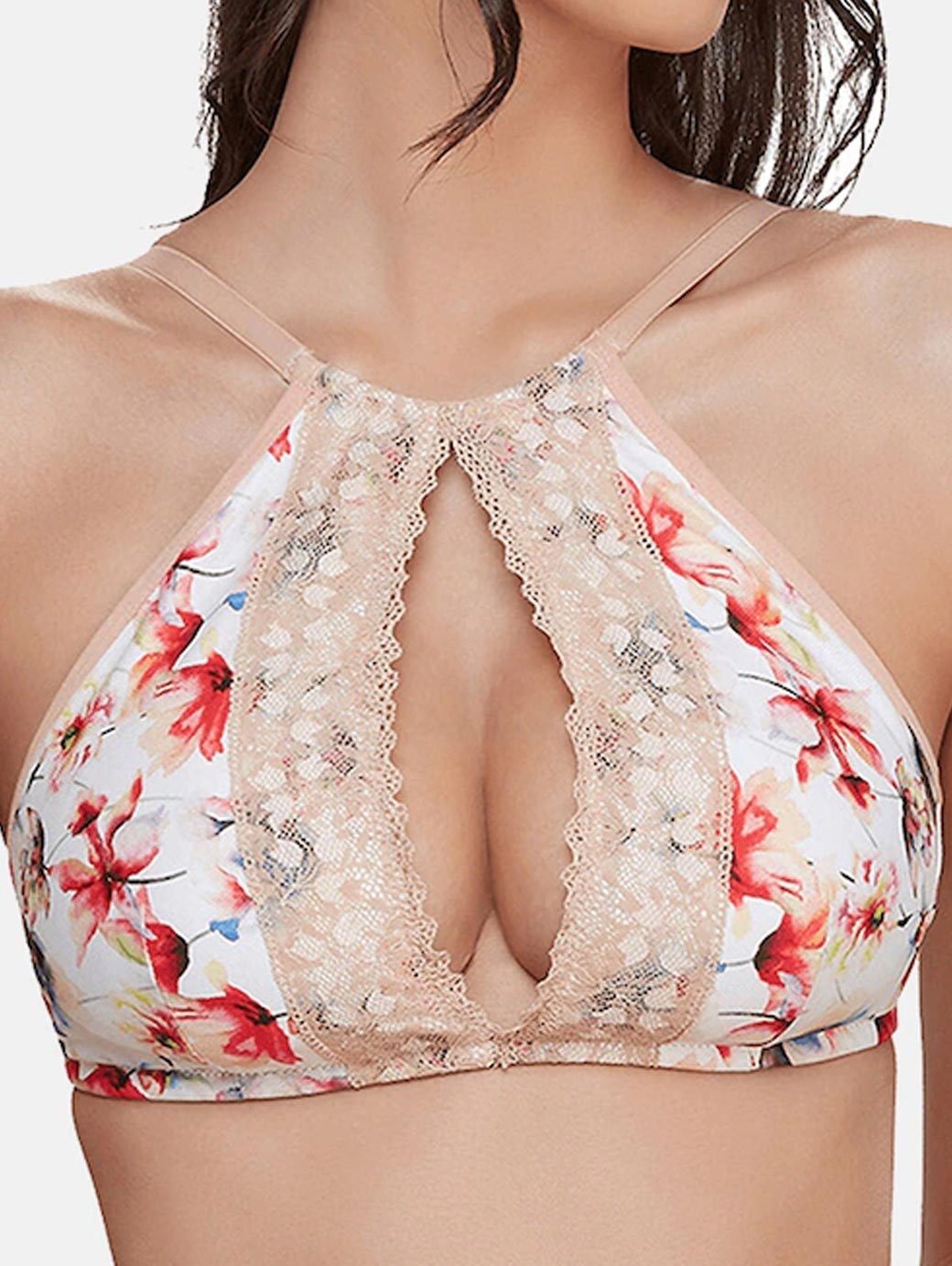 Peach-Coloured printed medium-coverage Bralette bra Lightly Padded and Non-Wired cut and sew cups Regular straps and back closure Back style: Regular Feature: Anti Microbial