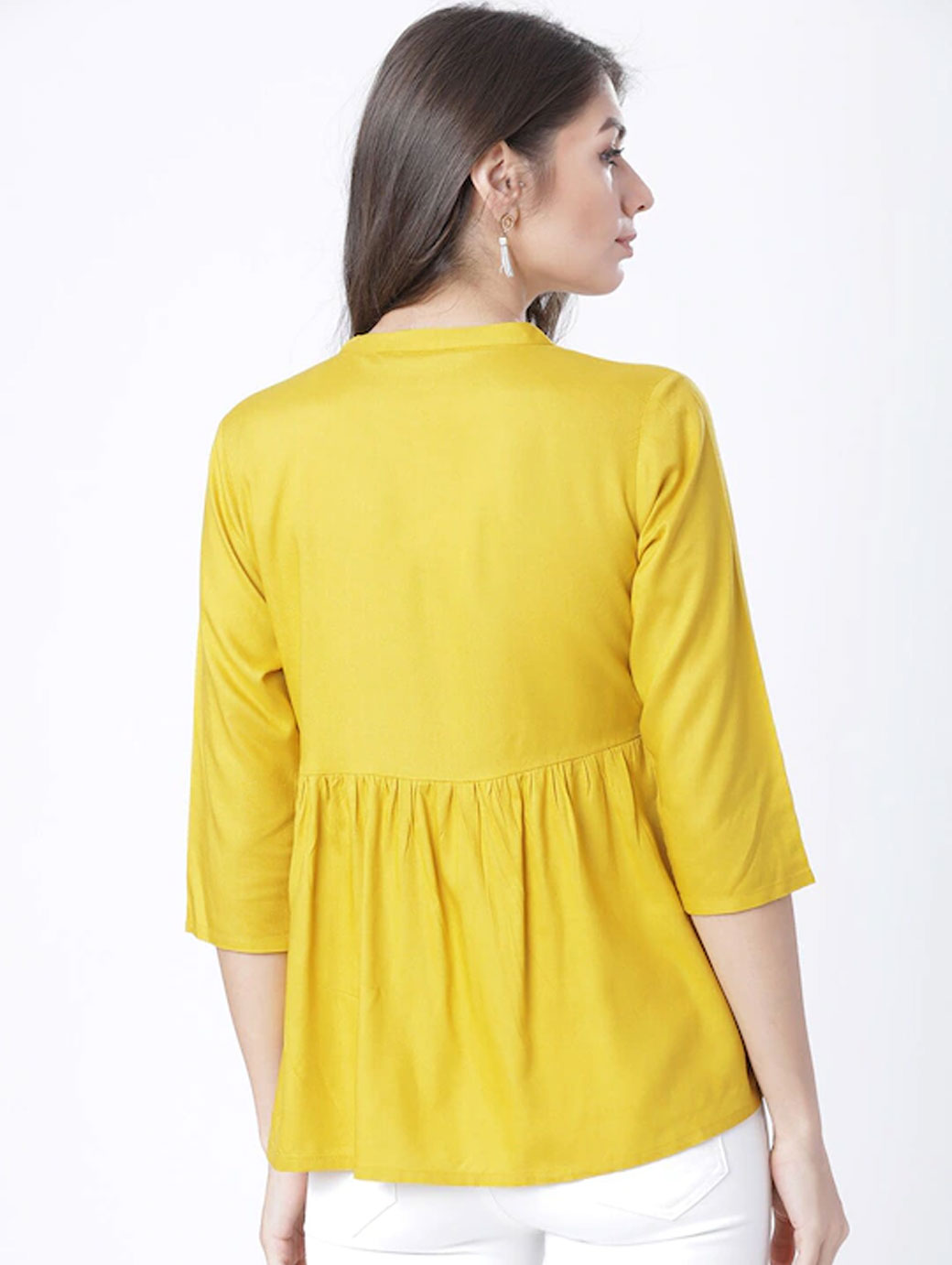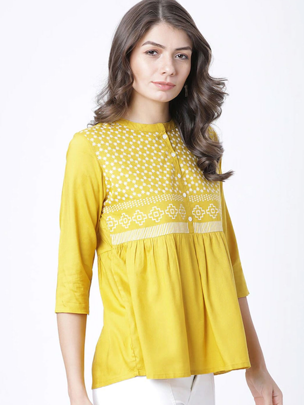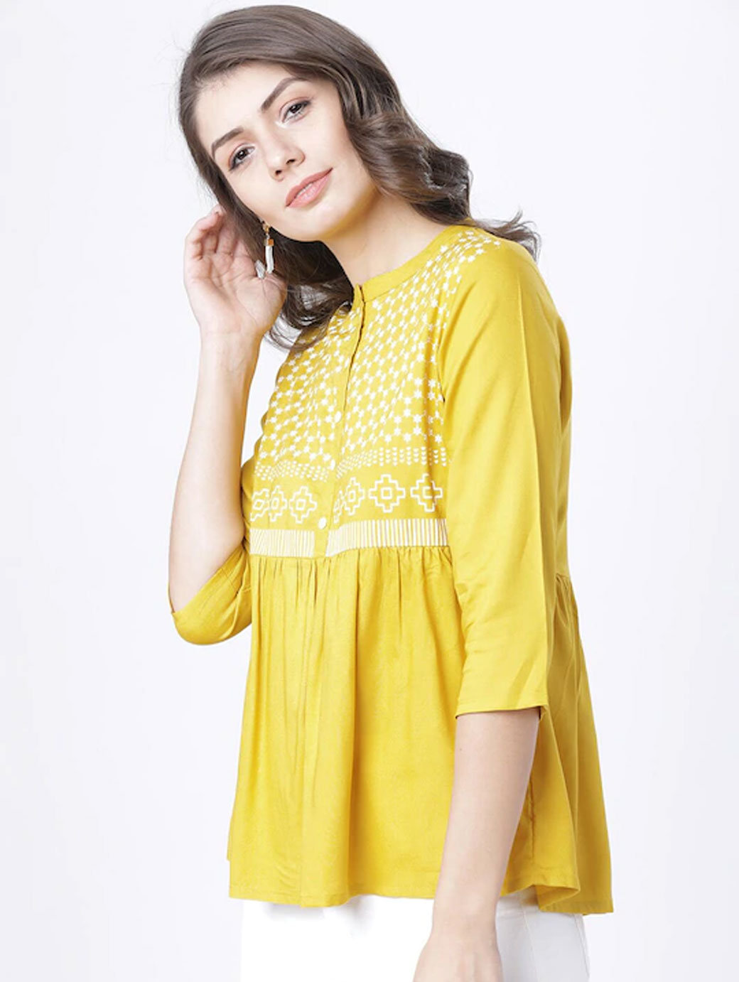 Mustard regular a-line Top printed woven round neck three-quarter sleeves , regular sleeves sleeves gathered or pleated hem button.