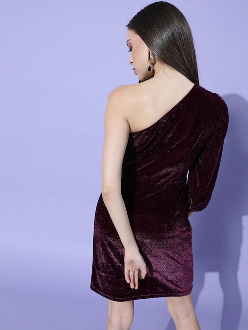 Deck up your wardrobe with this gorgeous dress. To add to the charm, this dress features a lovely one-shoulder and three-quarter bishop sleeves. Deep burgundy shade, Classic solid pattern, One-shoulder, Three-quarter bishop sleeves, Polyester, machine wash, Trend Alert, One-shoulder style features a garment with a single shoulder, leaving the other shoulder bare. This bold style draws attention away from the lower body, emphasising the neck and shoulder area.