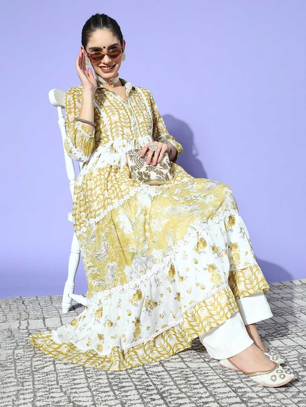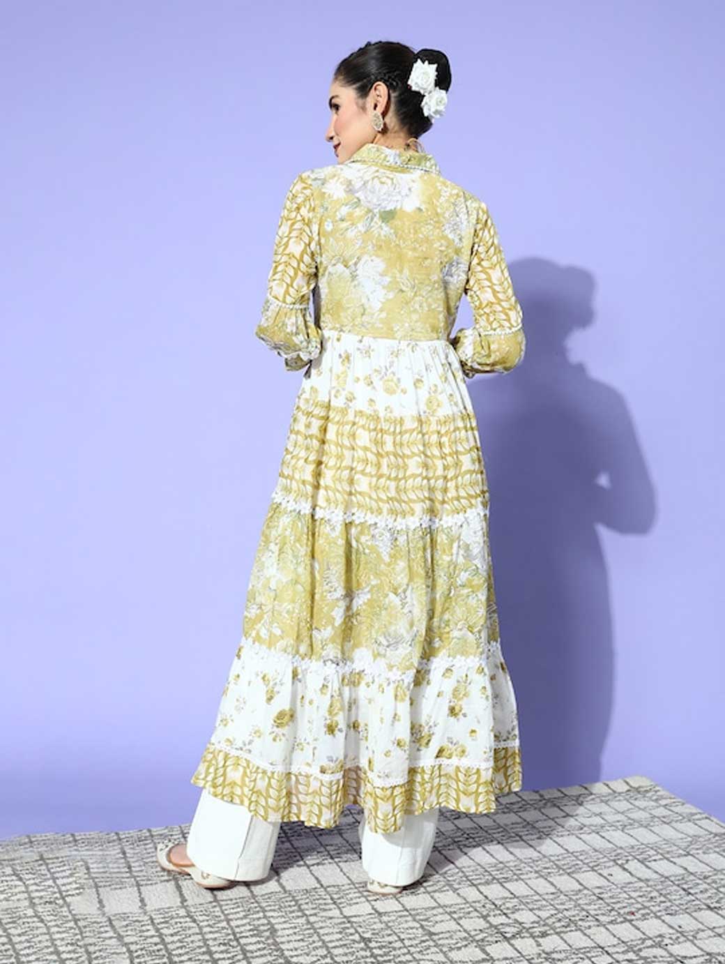 Become a trendsetter when you walk out of the house in this kurta. Designed with an alluring flared hemline and ankle length, this attractive kurta will lend you a traditional look. Elegant olive shade Three-quarter puff sleeves Flared hemline Ankle length Cotton, dry clean Trend Alert With gathered volumes, tiers, pleats, bias drapes, and swaying silhouettes, the swirling volumes trend is a mix of whimsical and playful femininity. It plays with beautiful prints and patterns, such as floral, pastel colour-blocking, embroidered, Nu Noheme, floral all-over print, ombre, rich gold foil print, porcelain blooms, and so on.