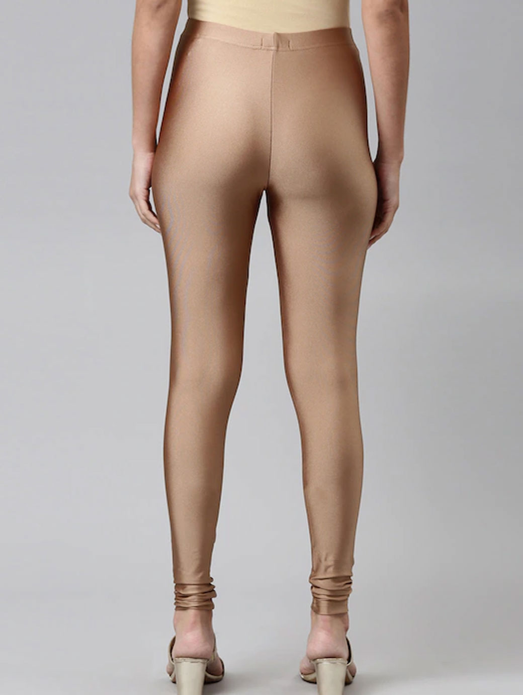 Gold coloured solid churidar-length leggings, has an elasticated waistband and slip-on closure