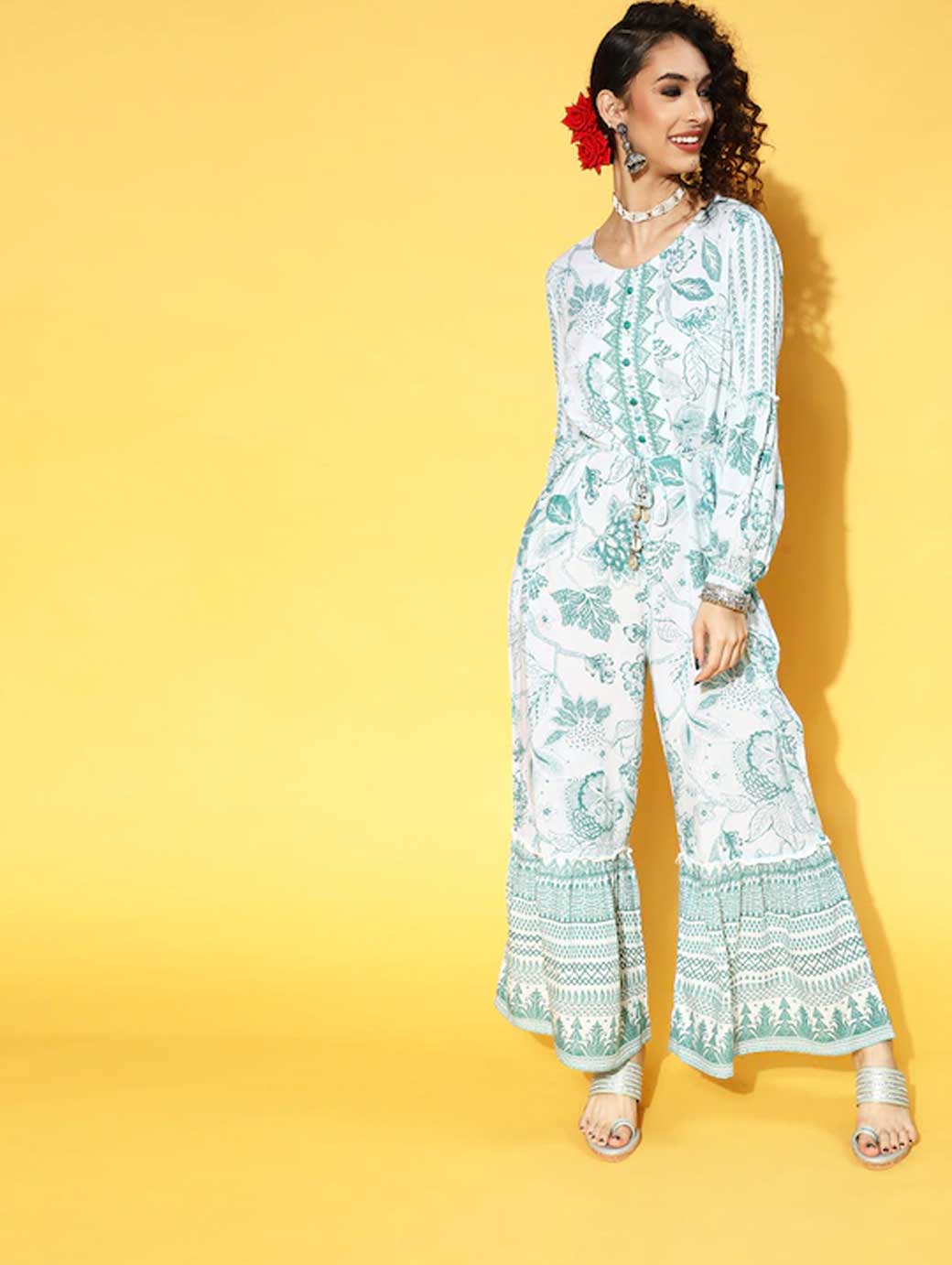 Ideal for everyday wear, this jumpsuit is both stylish and comfy. It is crafted with a beautiful printed pattern and attractive round neck to elevate your appeal. Gorgeous green shade Printed pattern Round neck Long sleeves Viscose rayon, hand wash Trend Alert Elevated bottoms include any to every pair of bottoms that are designed with edgy details, like a flare, slit, tiering, pleats, and so on. The trendy prints and patterns, such as ombre, warli, quirky, polka dots, garden artist, pastel colour-blocking, floral, etc. further enhance their appeal.