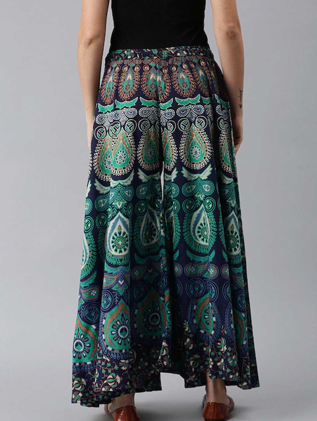 Women Green & Navy Blue Ethnic Motifs Print Flared Palazzos
