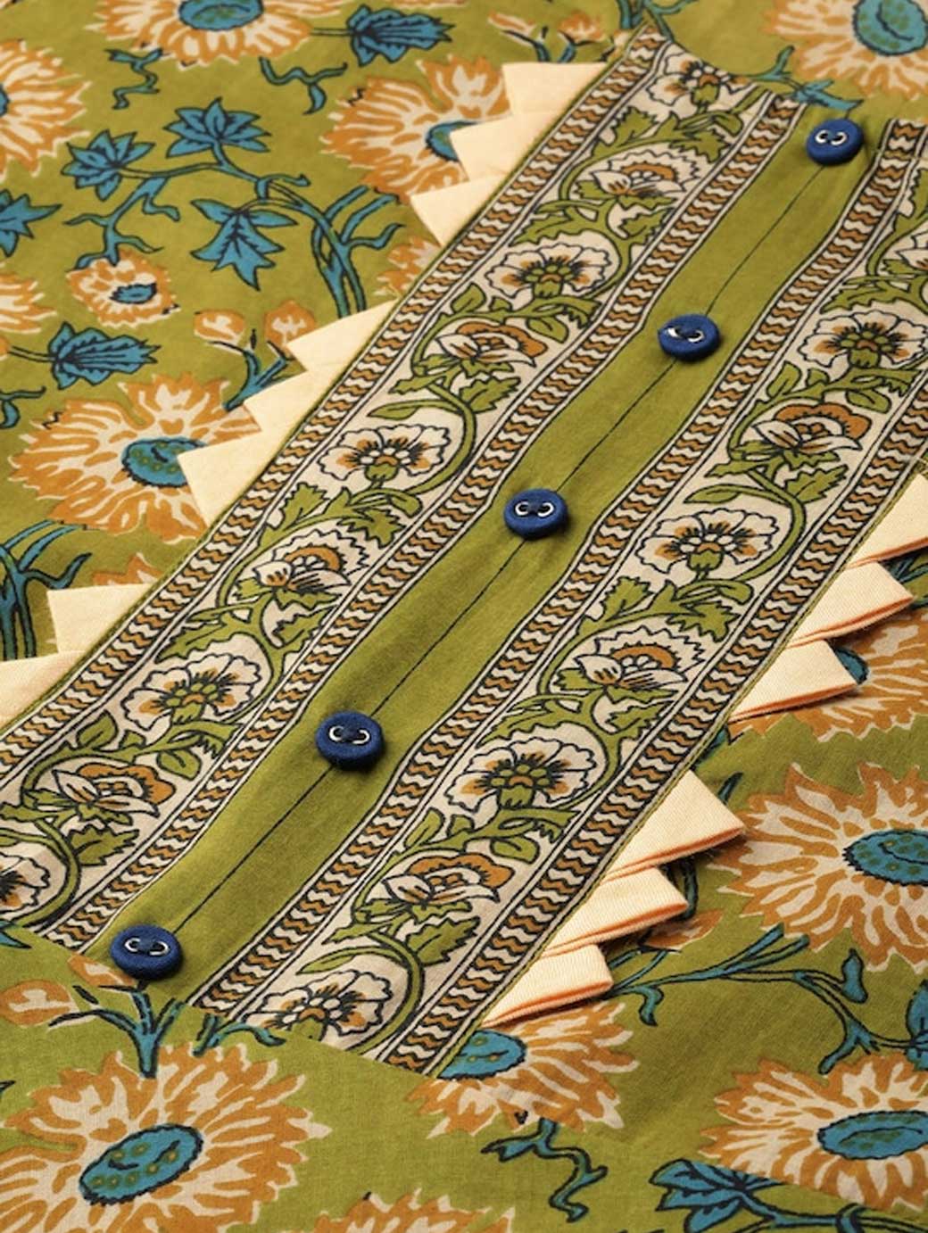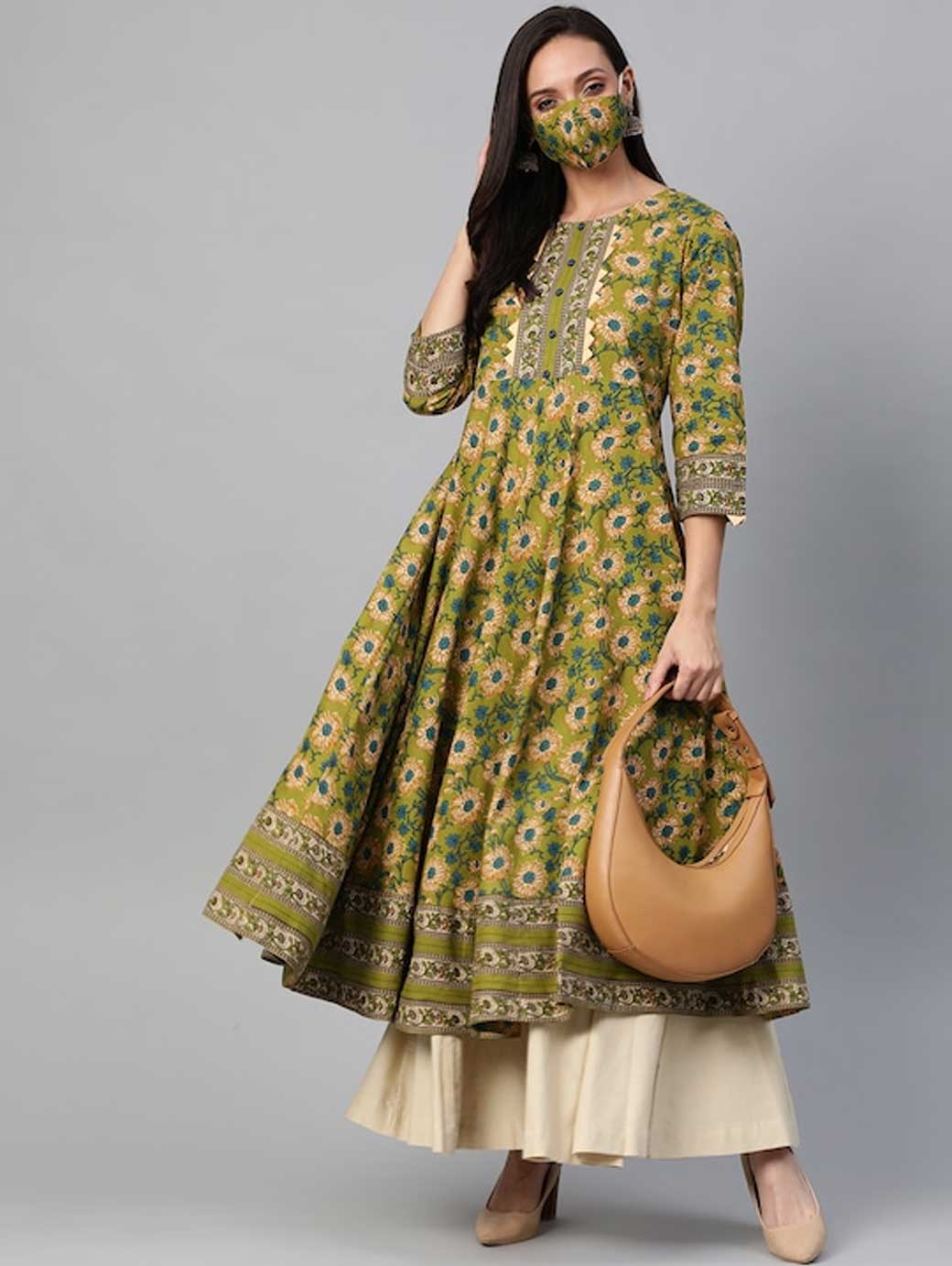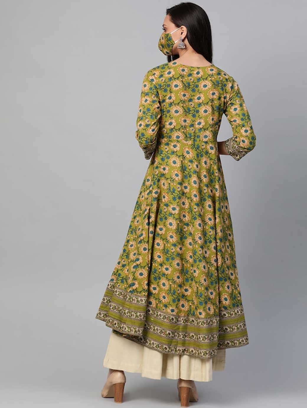 Green and teal blue floral printed anarkali kurta, has a round neck, three-quarter sleeves, and flared hem This product does not come with a mask. The mask on the model is only for styling purpose.