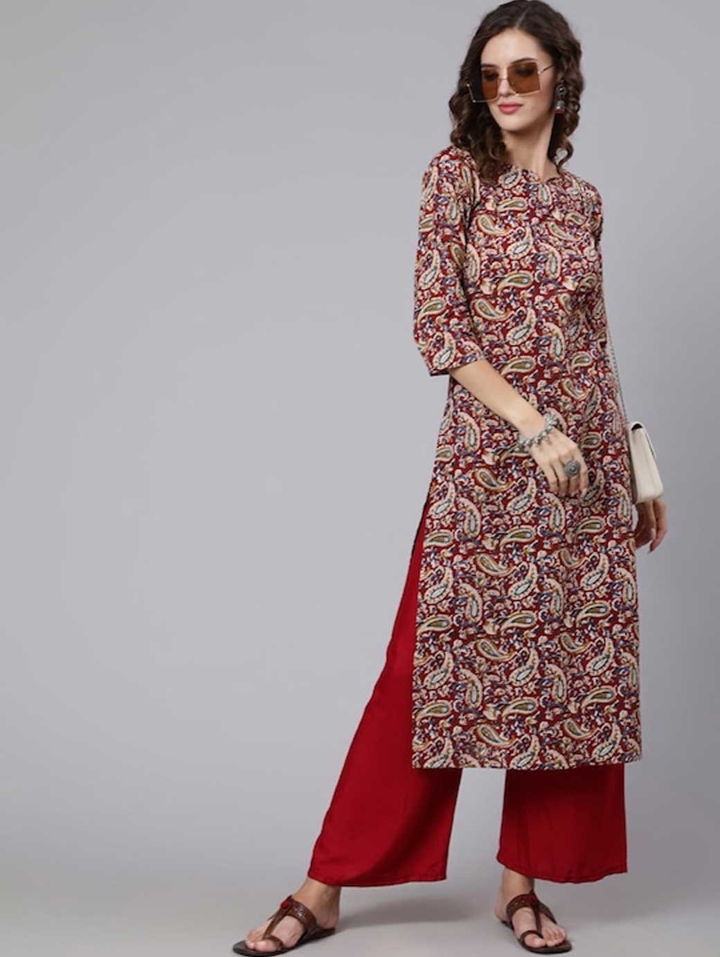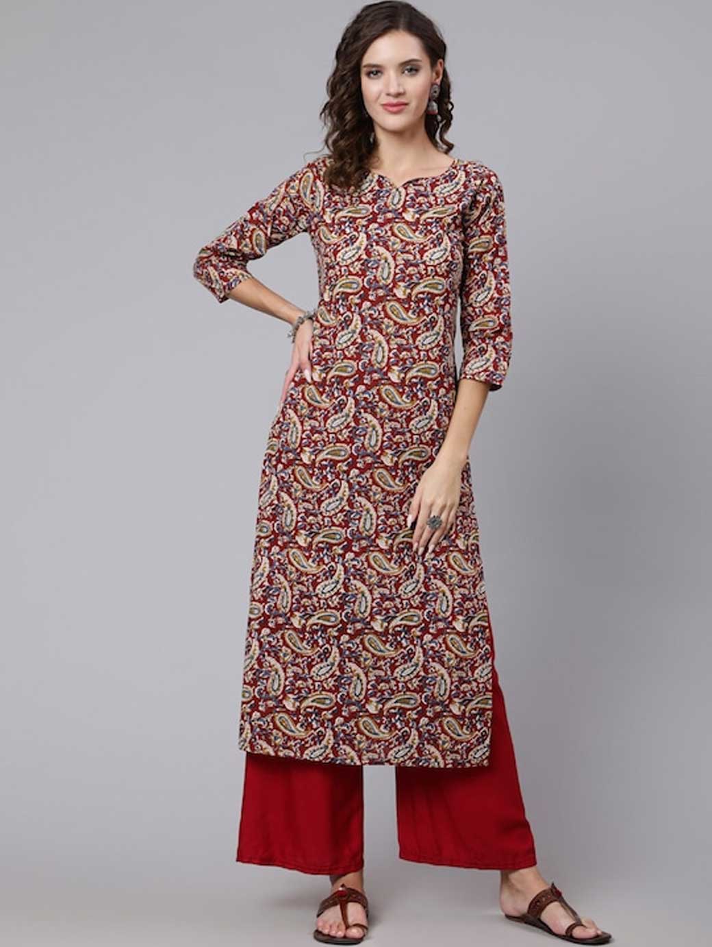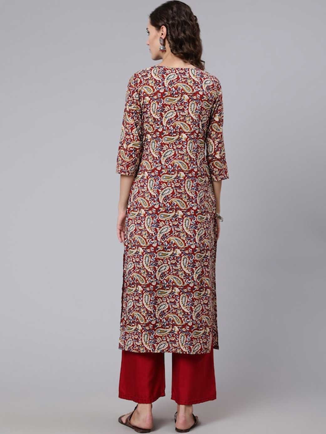 Maroon, blue and beige Paisley printed Round neck Three-quarter, regular sleeves Straight shape Calf length with straight hem Machine weave regular cotton