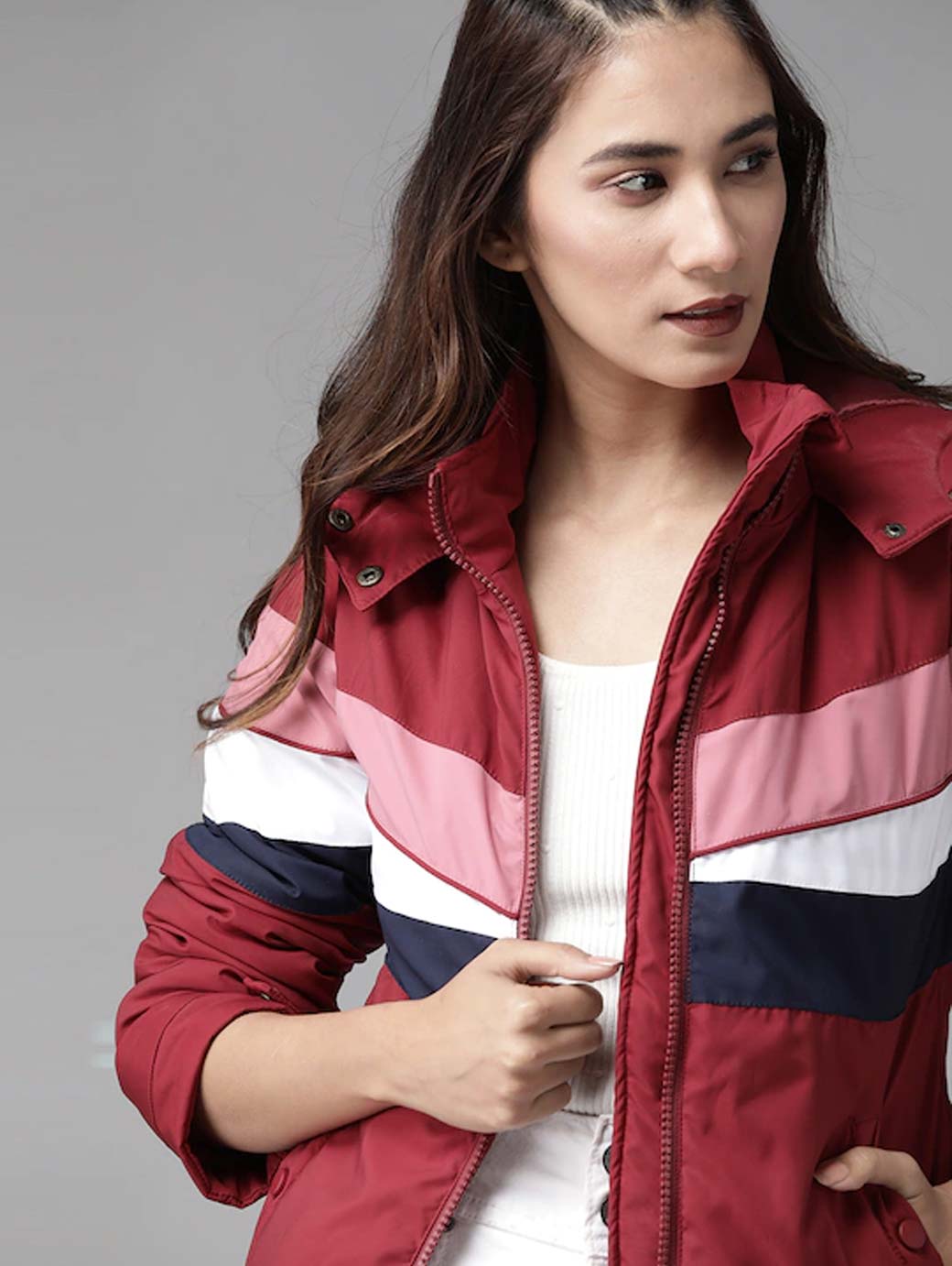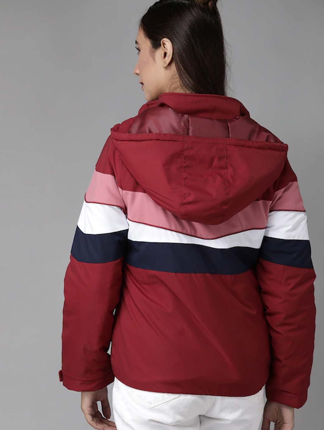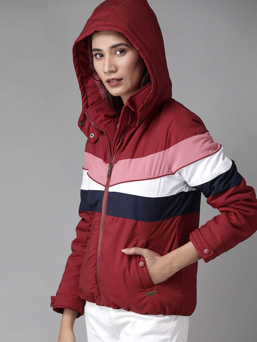 Maroon, navy and white striped padded jacket, has a hood, 2 pockets, zip closure, long sleeves, straight hem, and faux fur lining with 1 in-built pocket