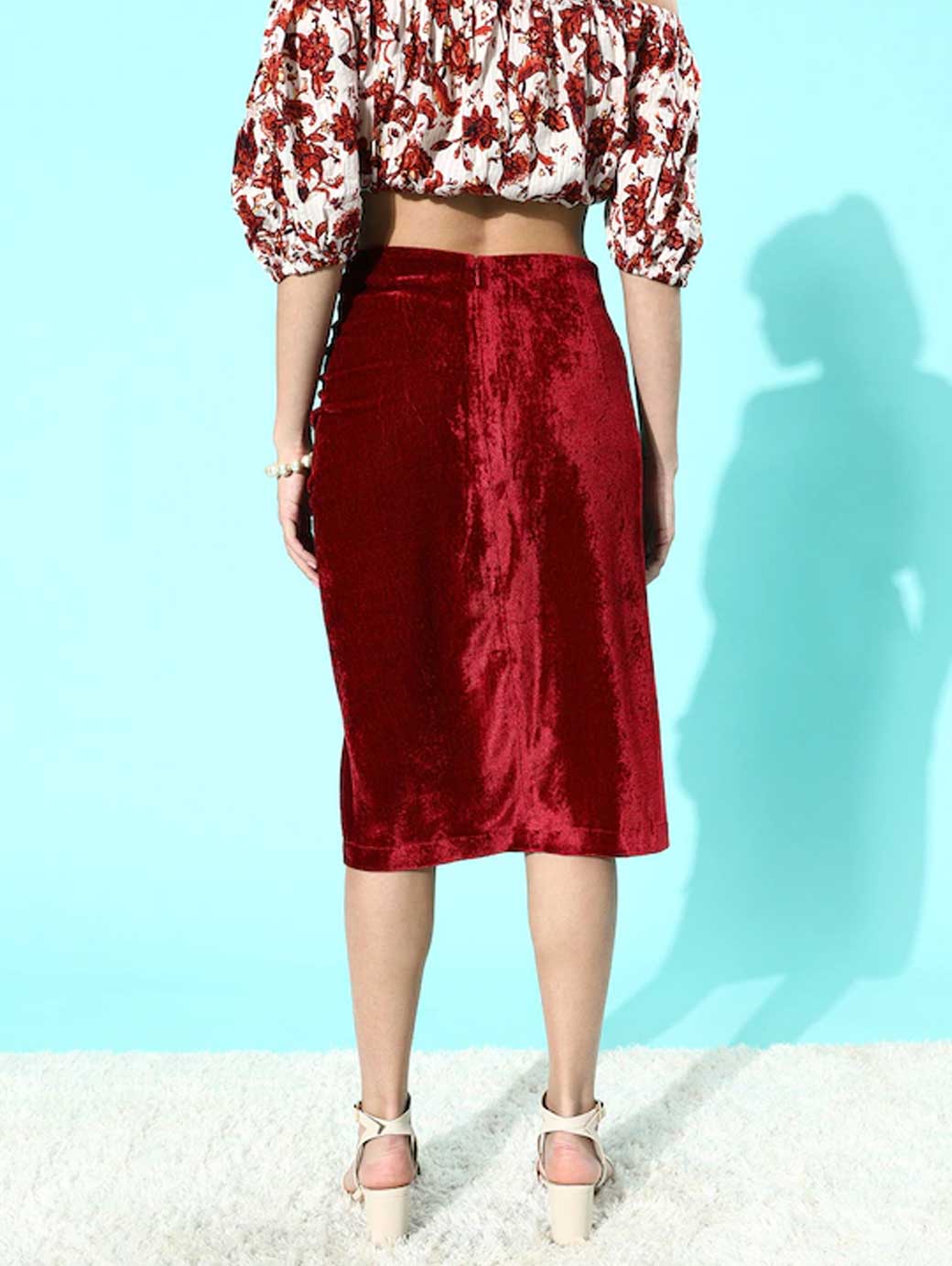 Maroon solid velvet straight skirt, pleated with tie-up detailing, straight hemline with side slit and concealed zip closure