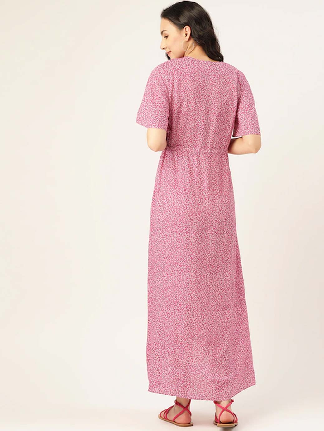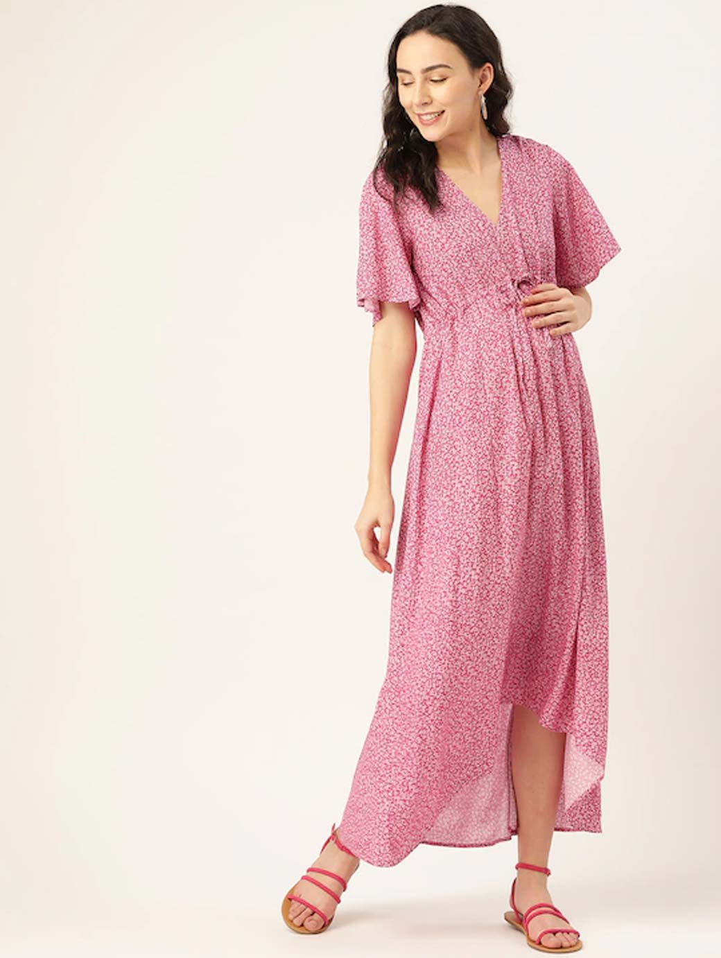 Pink and White printed woven Maternity maxi dress with tie-up, has a V-neck, short sleeves, and high-low hem.
