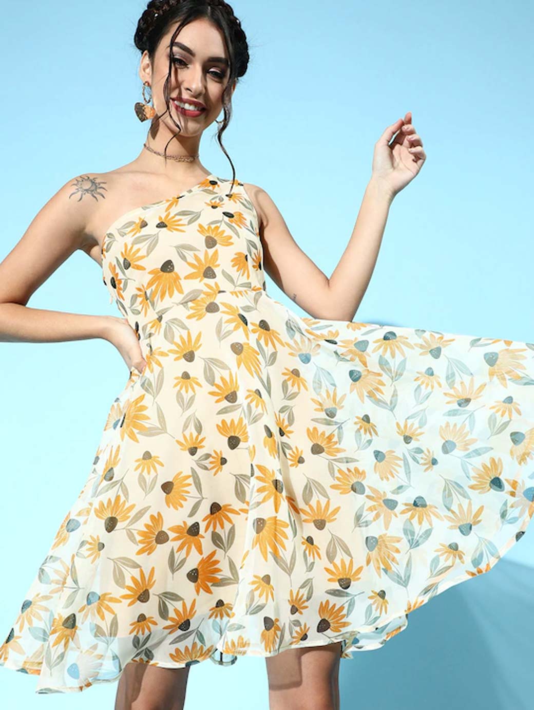 Yellow and white floral print fit & flare dress, One shoulder, Sleeveless, no sleeves, Above knee length in curved hem. Zip closure